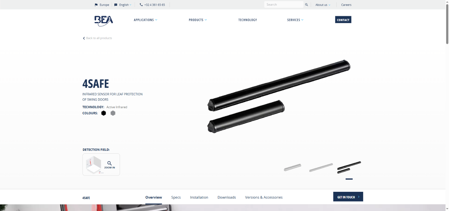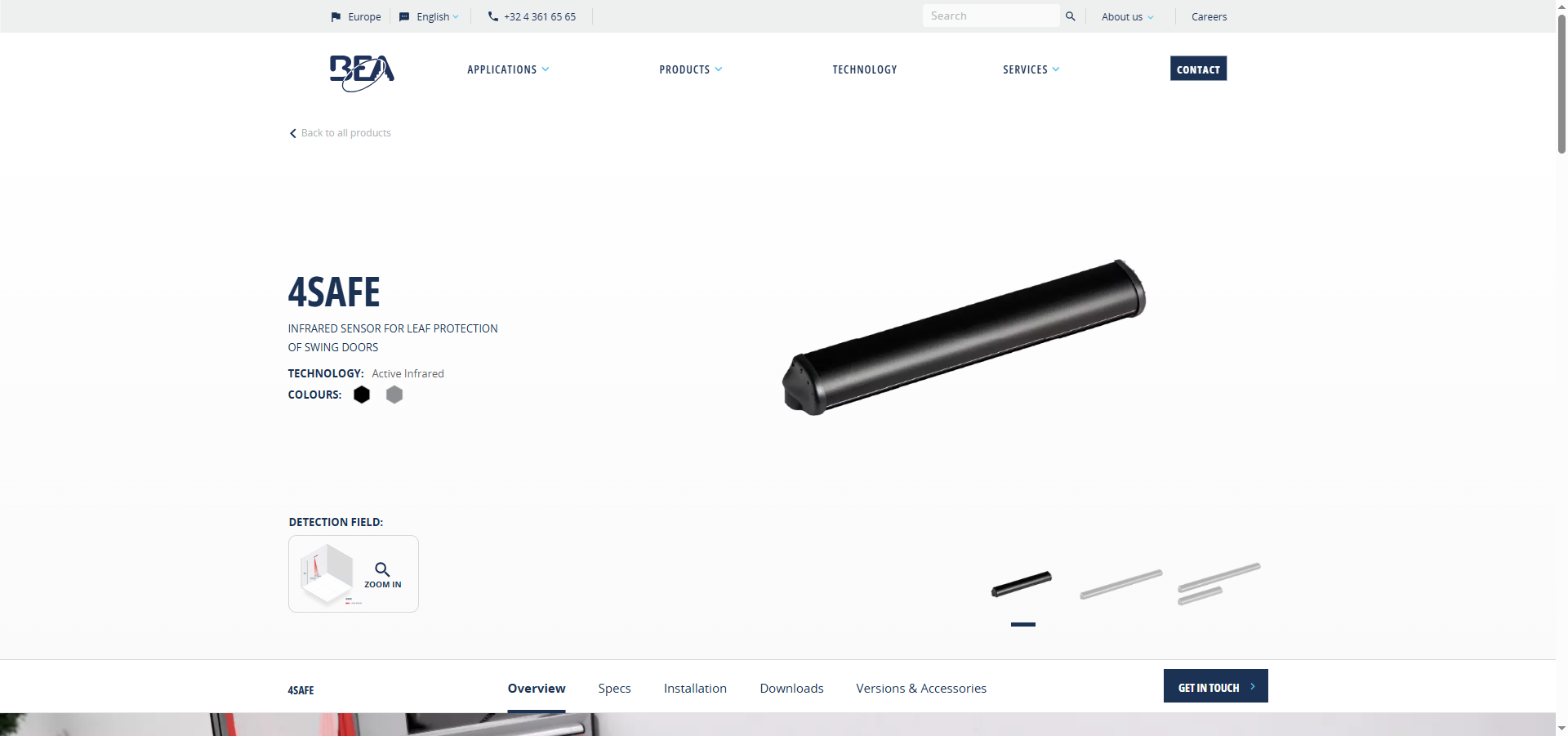 The BEA 4SAFE is a failsafe active infrared sensor that uses distance-measuring technology to protect people from contact with swing and revolving door leaves in motion. Mounted directly on the door leaf, it creates a three-dimensional detection field — making it especially well suited for protecting people with disabilities and children.